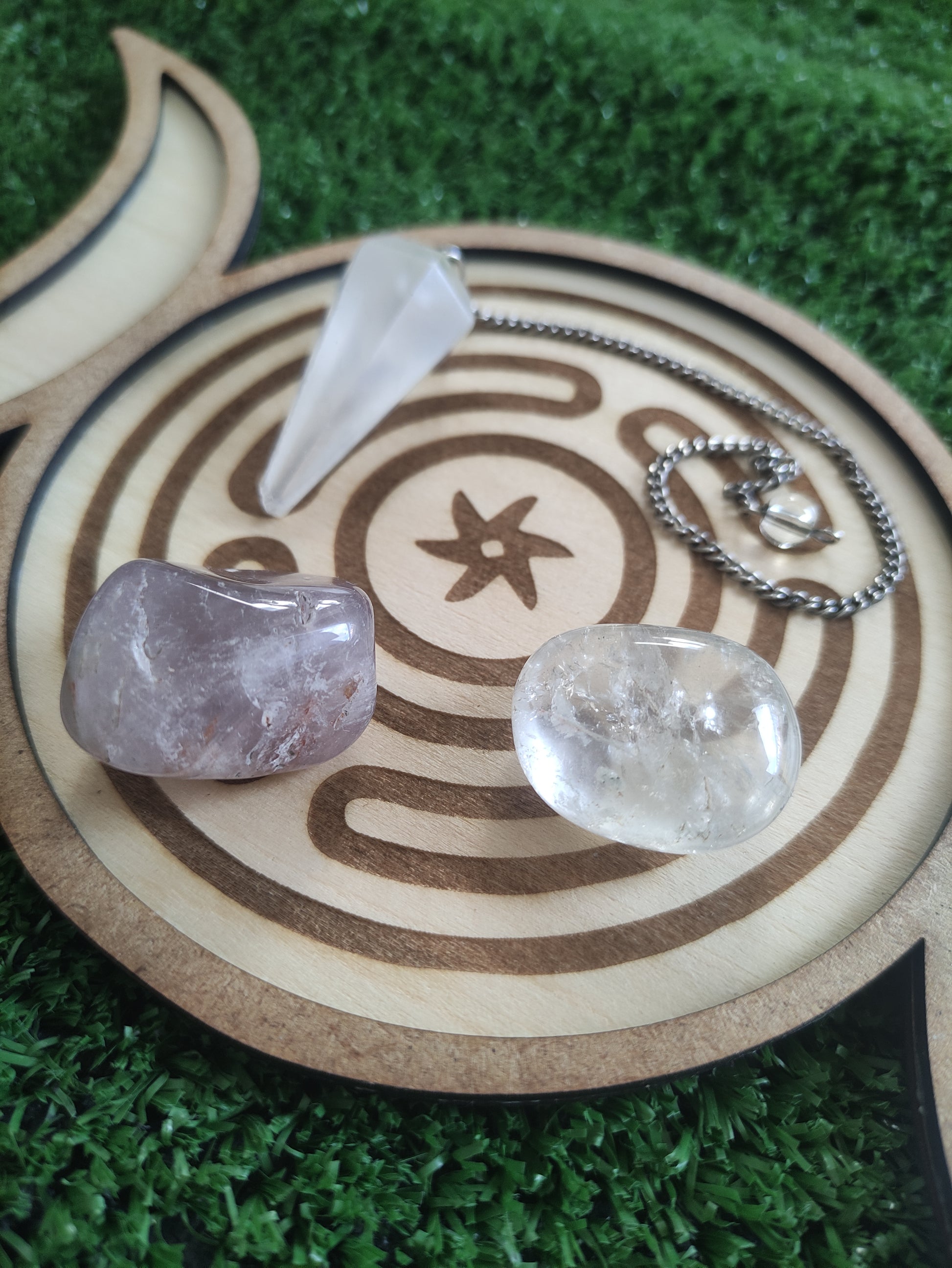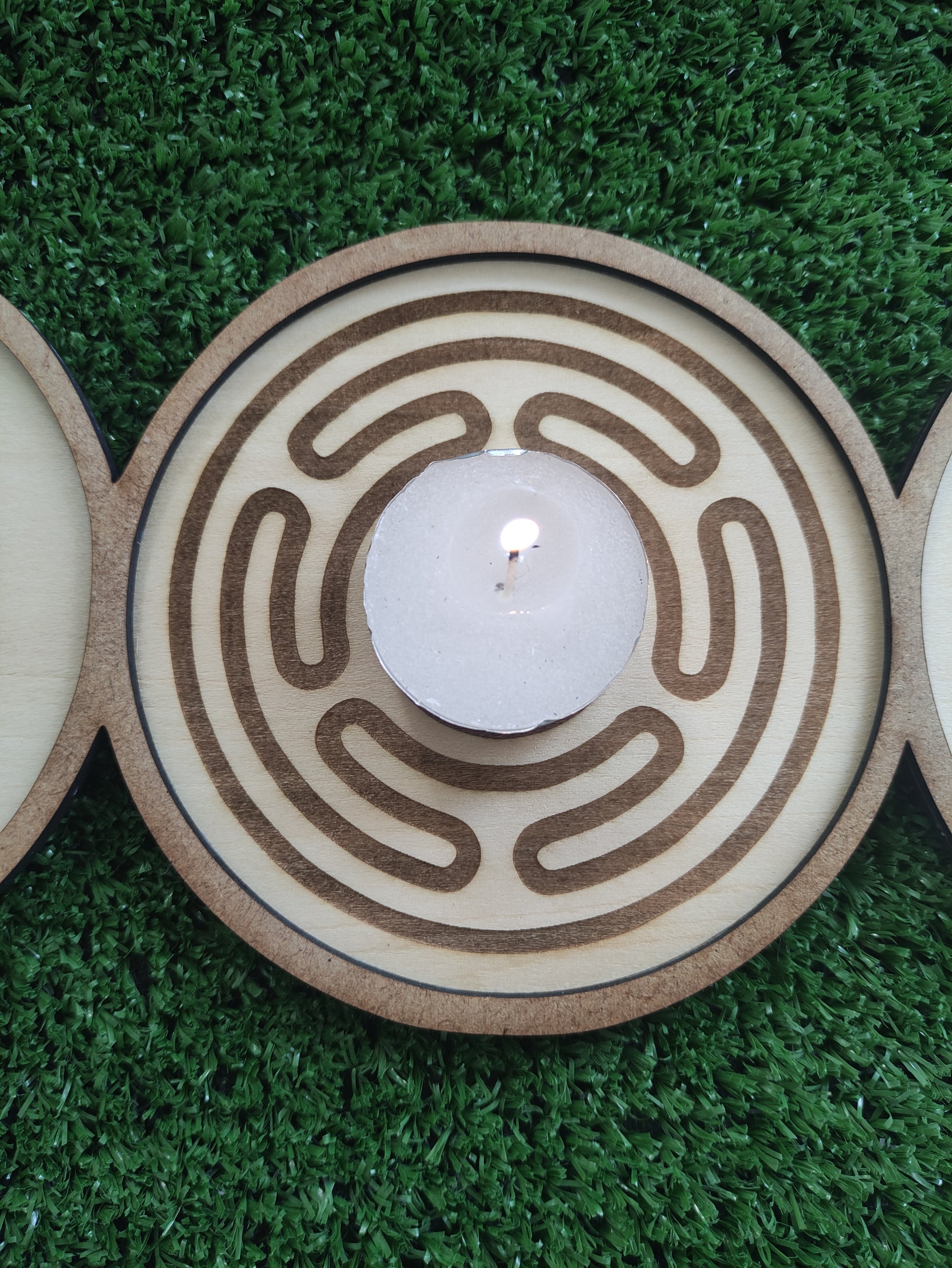 Al centro, el símbolo de Hécate, guardiana de los caminos y Señora de la magia, aporta protección espiritual, guía en las decisiones y una profunda conexión con lo oculto y lo ancestral. Su presencia en la base amplifica la intención, fortalece los rituales y abre portales de sabiduría interior.