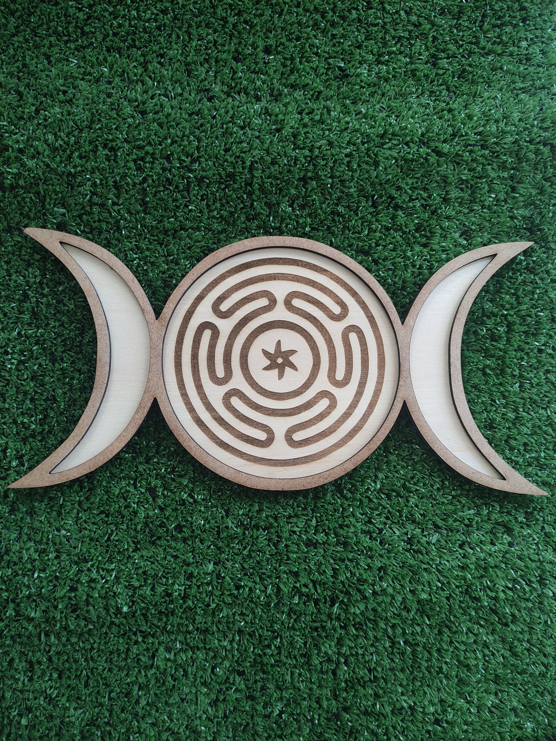 La Base Ritual Triple Luna con el Símbolo de Hécate es una pieza sagrada diseñada para acompañar prácticas de magia, protección y conexión con la energía de la Diosa. La Triple Luna representa los tres aspectos divinos —Doncella, Madre y Anciana—, simbolizando los ciclos de la vida, la intuición y el poder femenino en todas sus fases.
