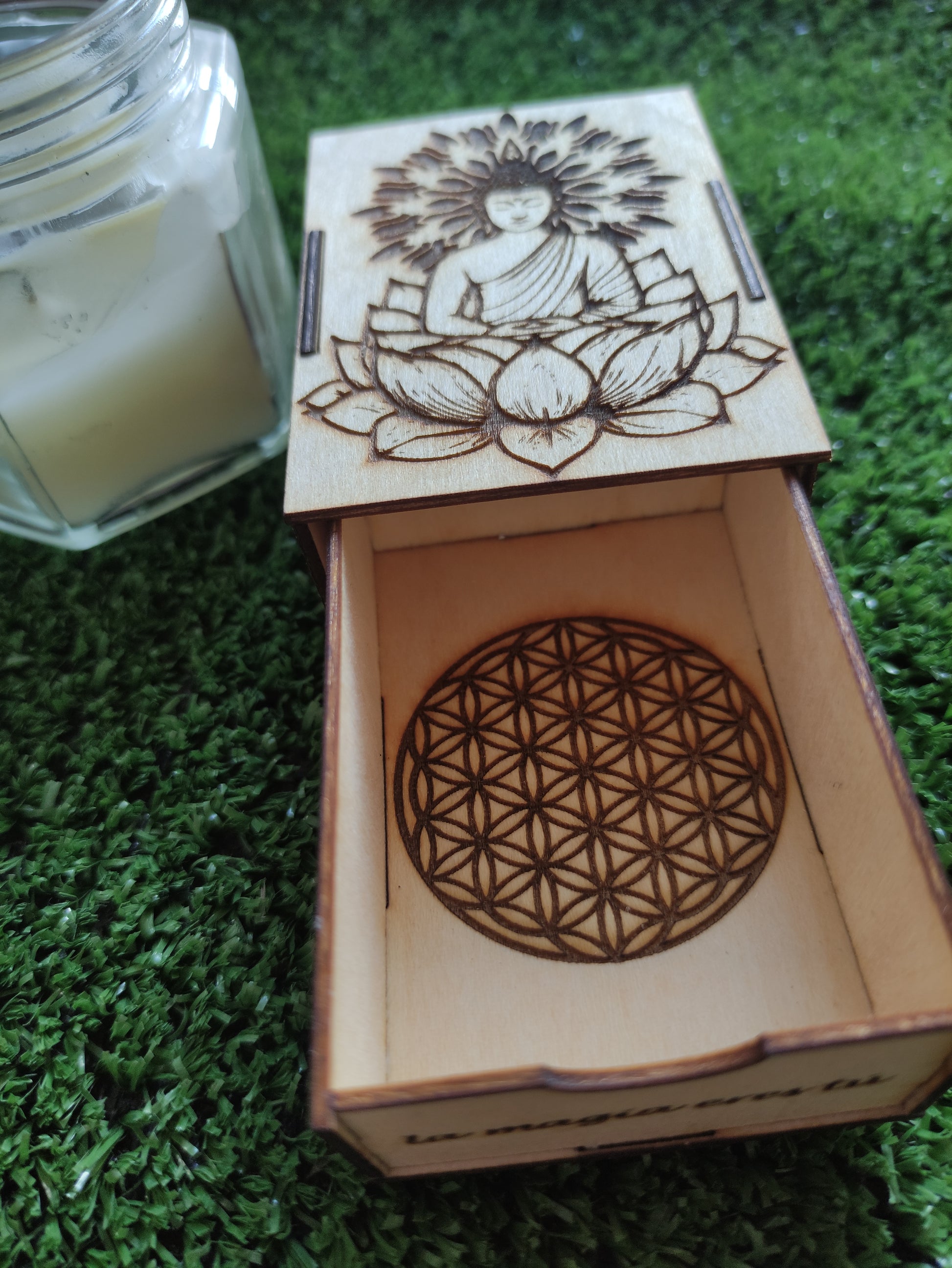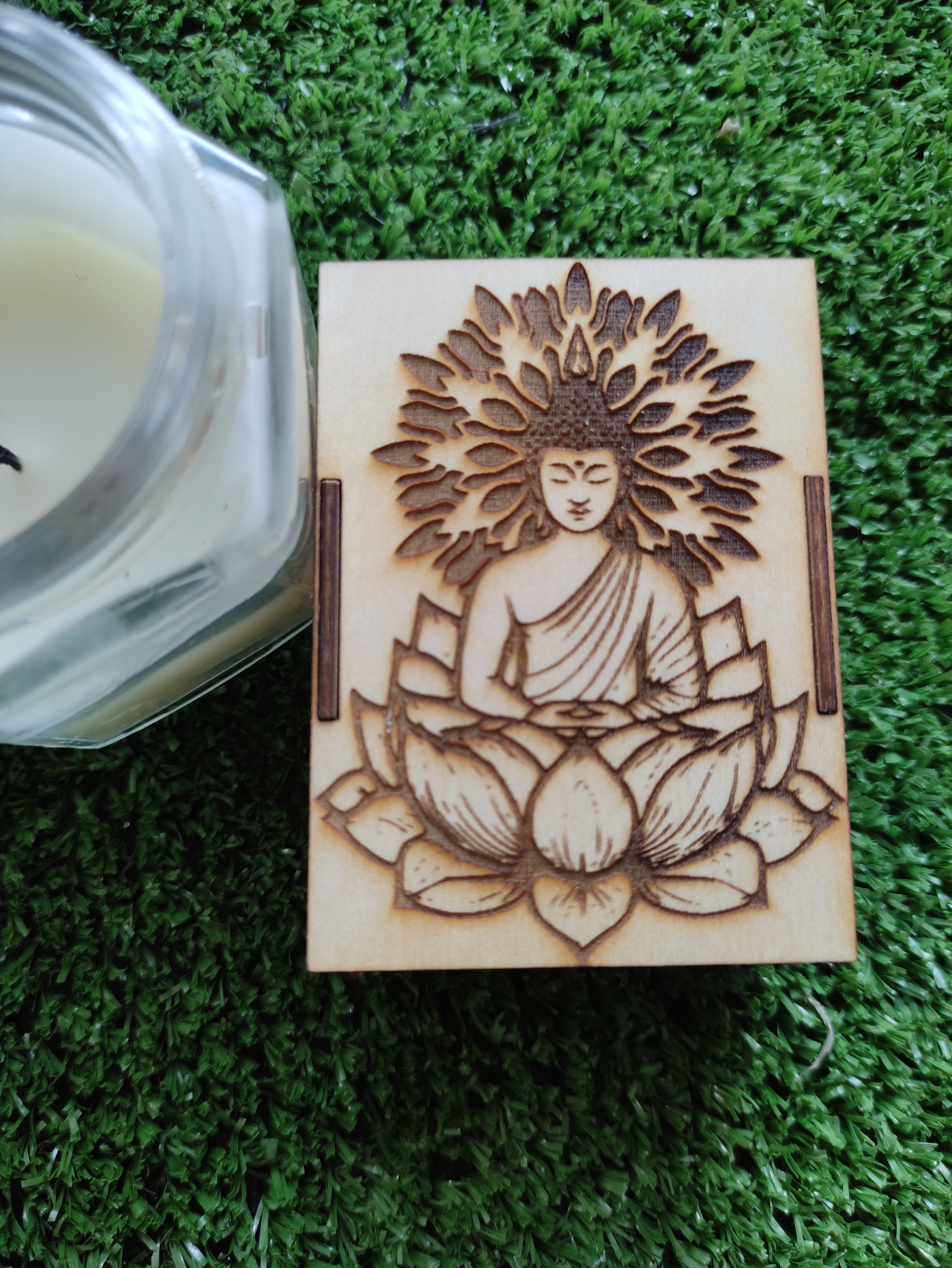 Cajita de cerillas con diseño buda sobre loto para conectar con sus energías de meditación y renovación.