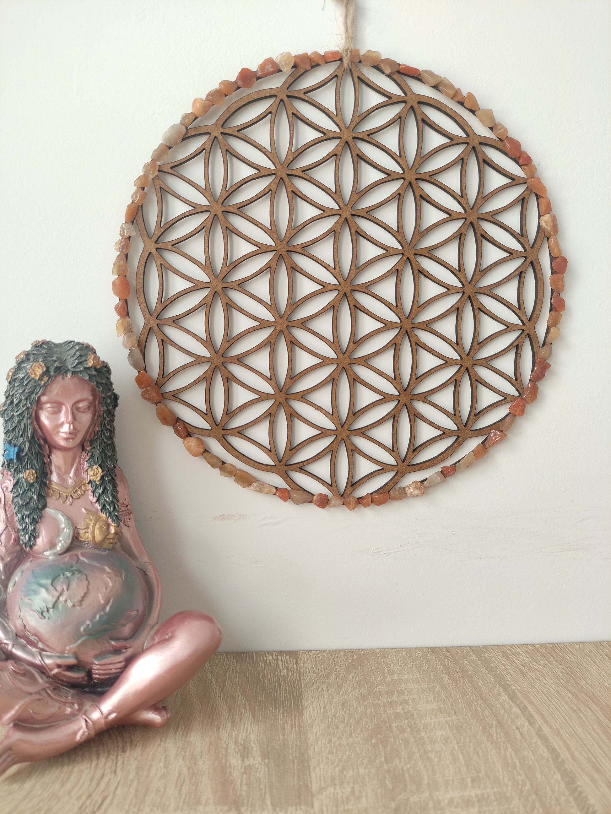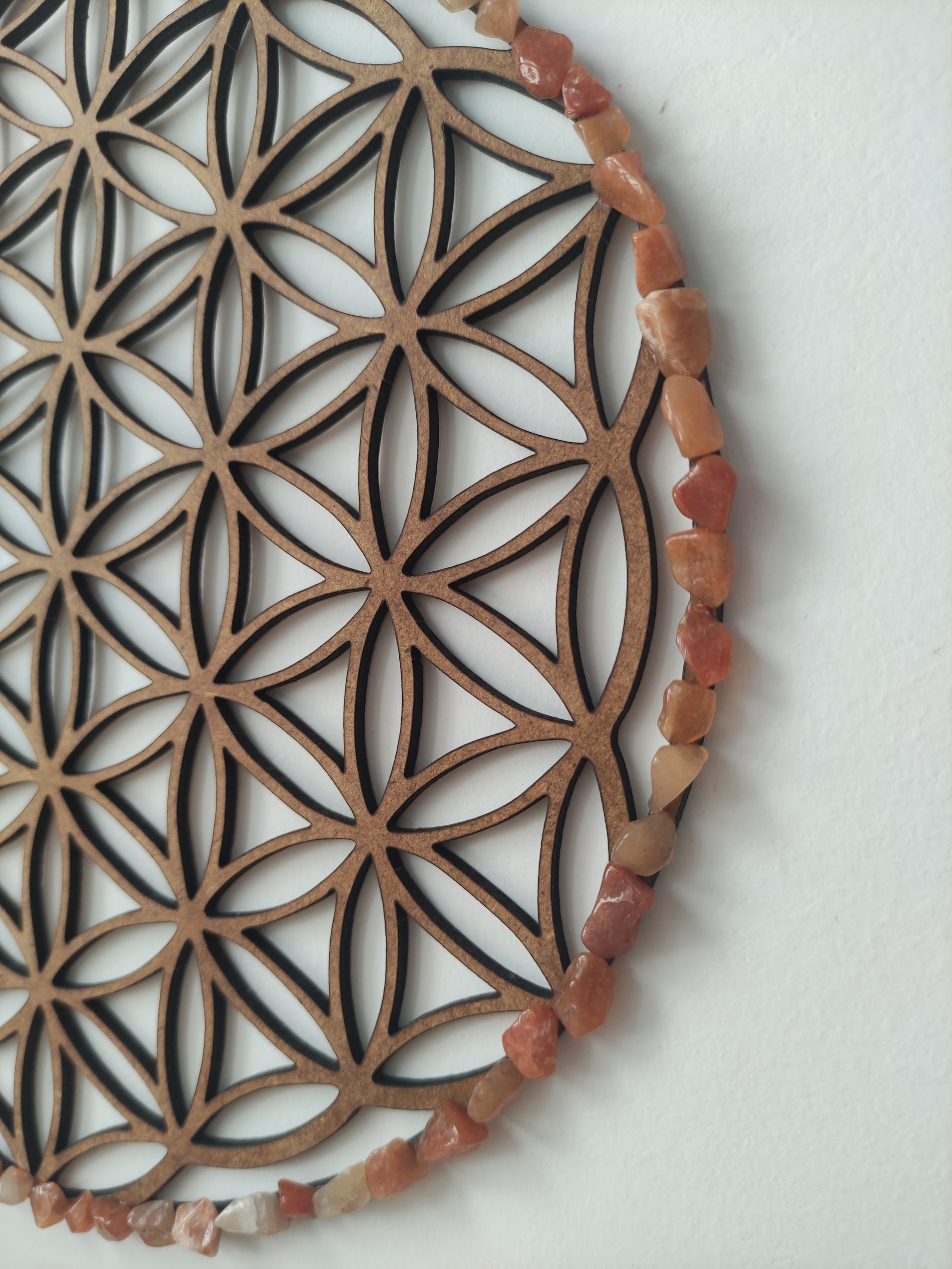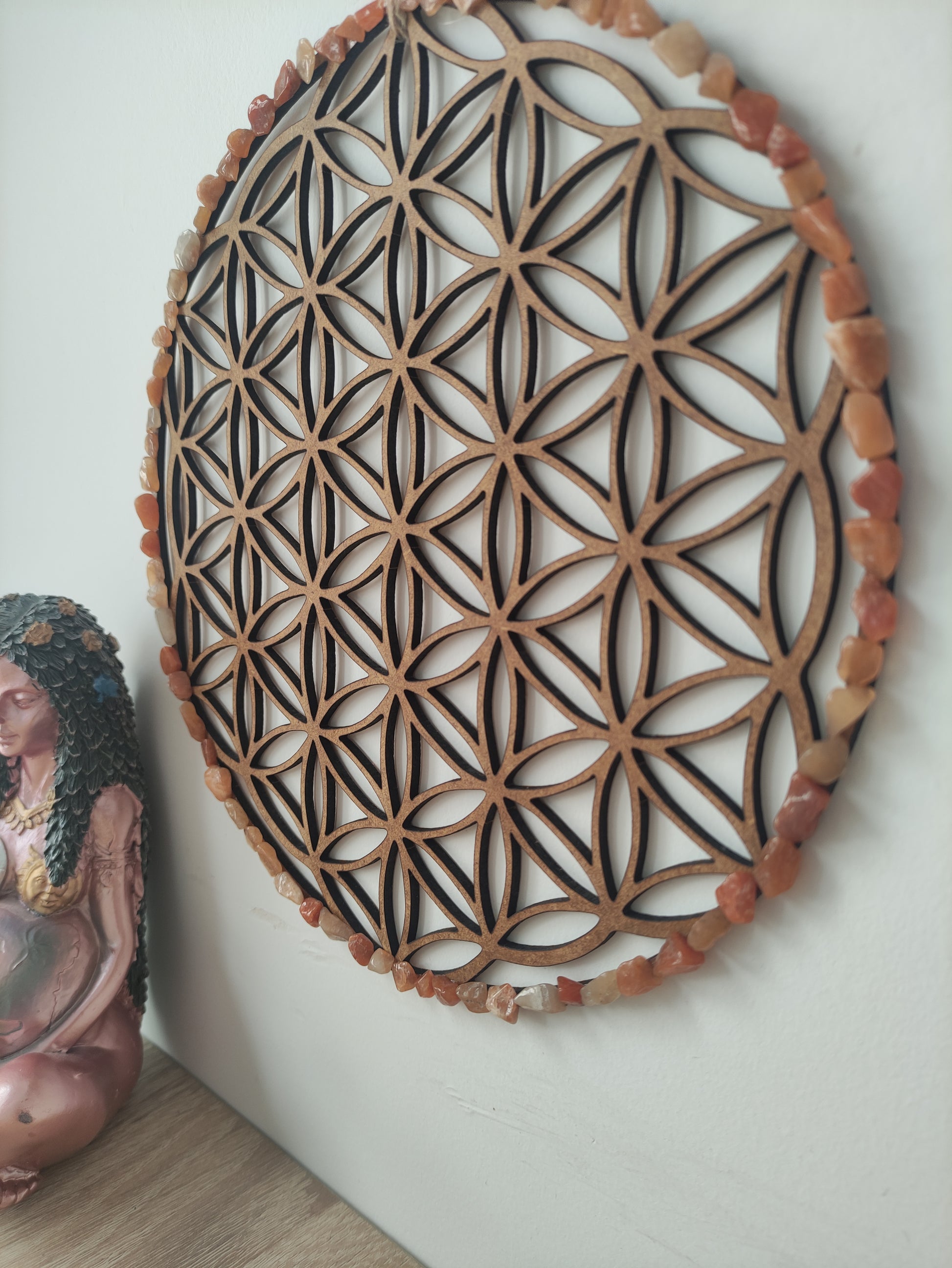 Conecta con la energía de la geometría sagrada con ésta flor de la vida de 21 cms.y la energía de la Ágata roja.