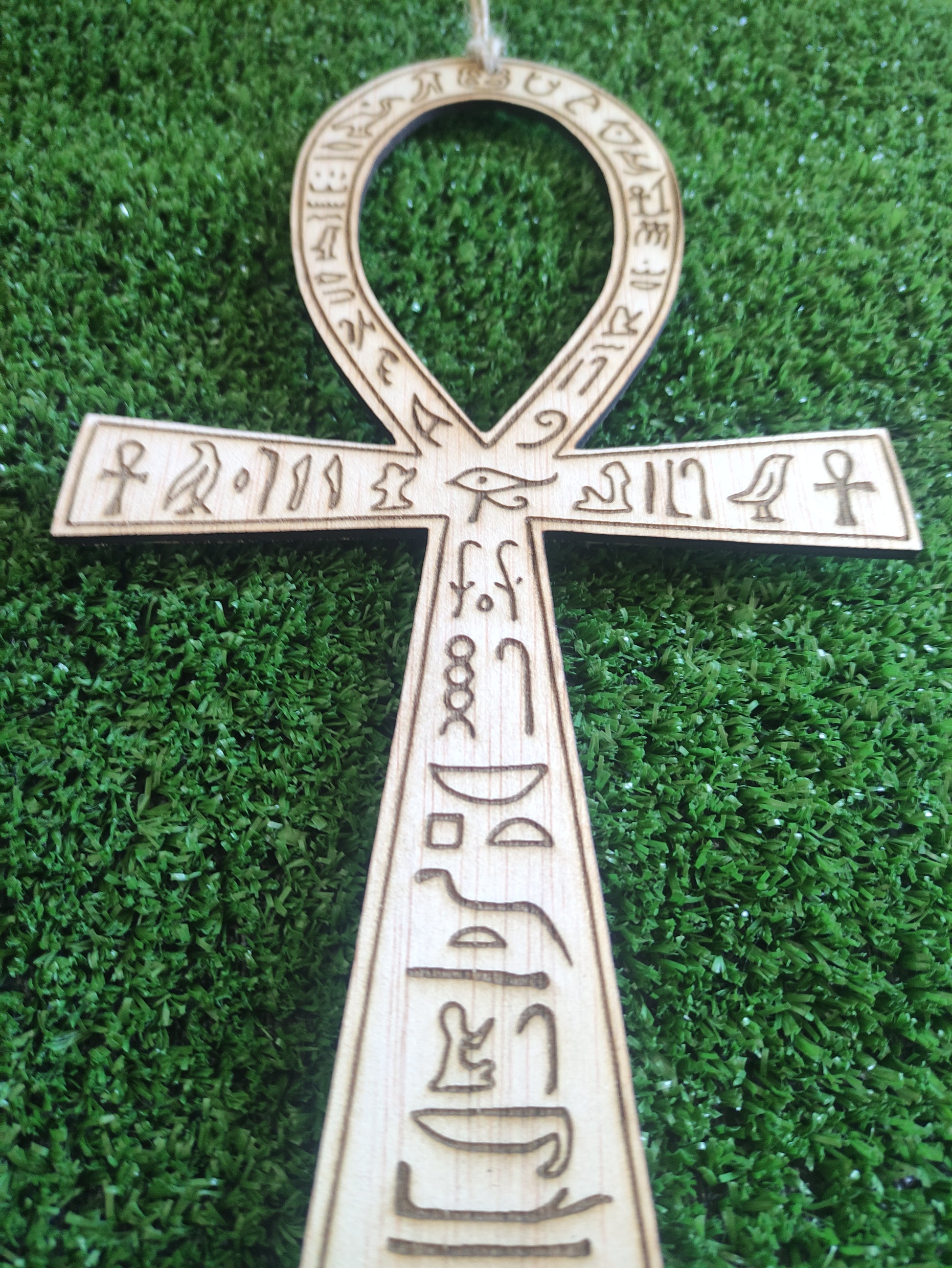Esta pieza está elaborada en madera y decorada con jeroglíficos grabados, lo que realza su fuerza simbólica y la convierte en un amuleto único. El diseño no solo embellece sino que también potencia su función como herramienta energética y espiritual, ideal para proteger espacios, atraer armonía y servir de guía en el camino personal.