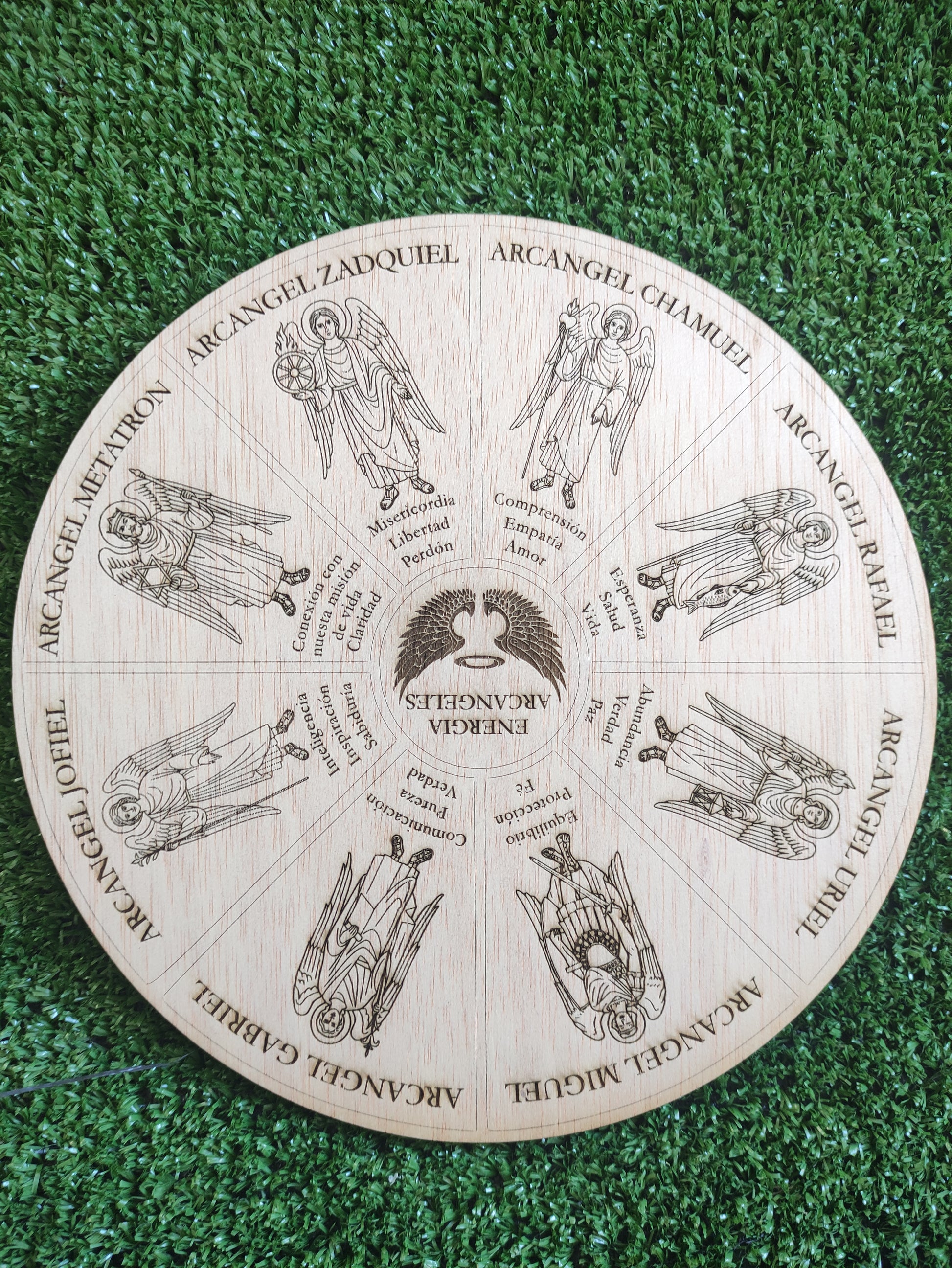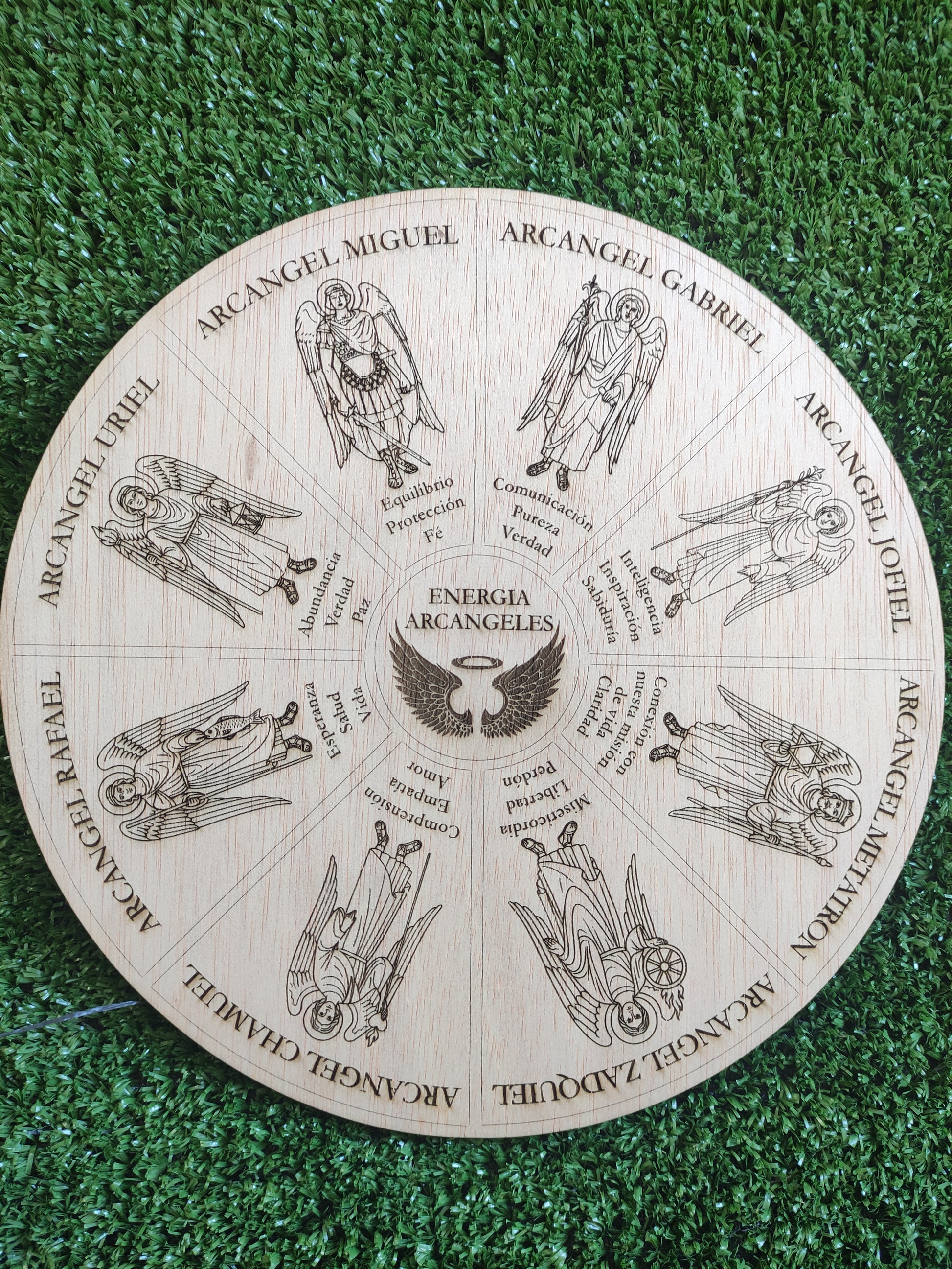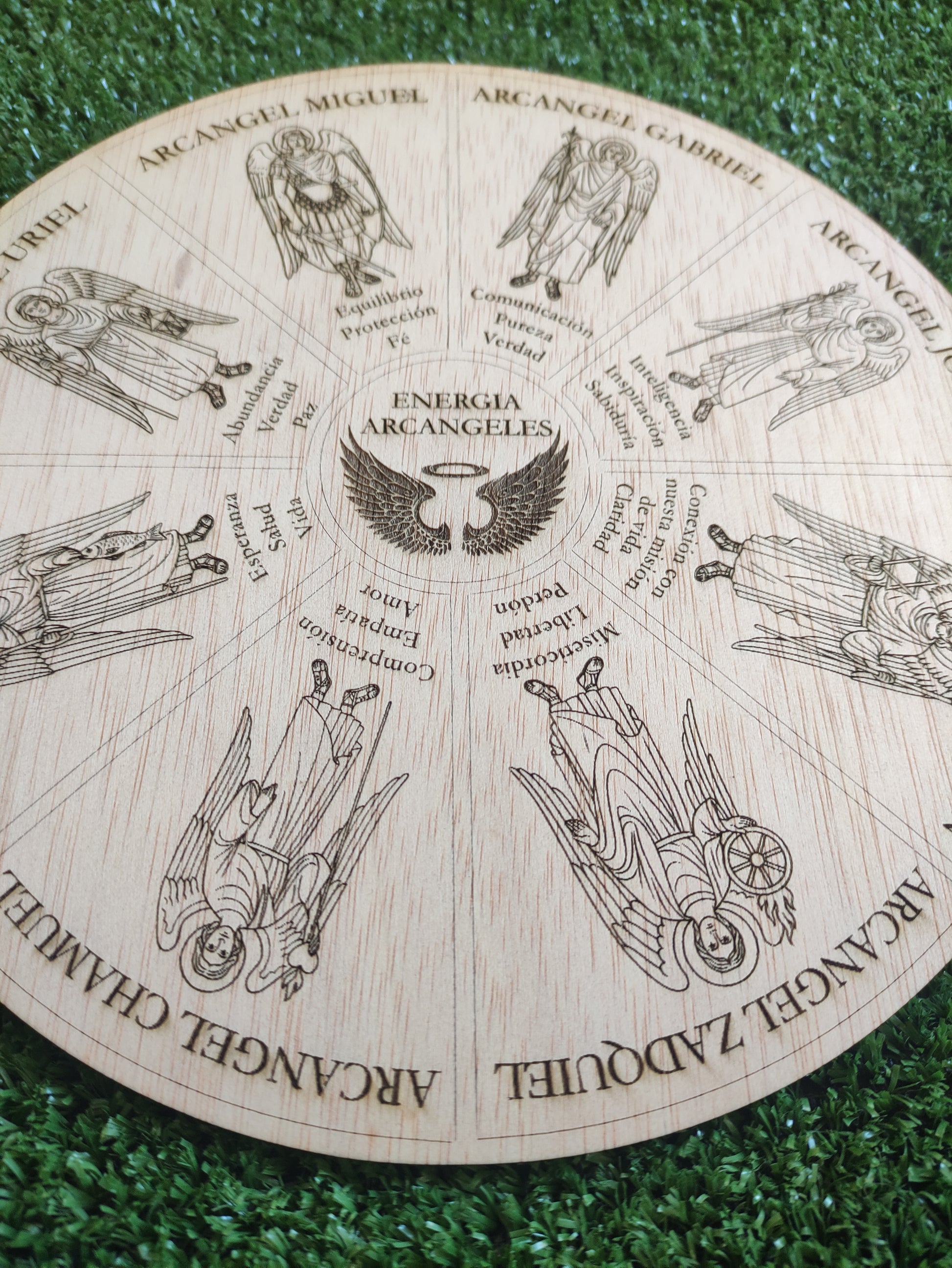 Diseñada como un círculo sagrado, esta rueda representa la protección, guía y luz divina de los principales arcángeles, permitiendo conectar con su energía de manera armónica y profunda. Cada sección está dedicada a un arcángel específico, destacando su propósito y bendiciones: