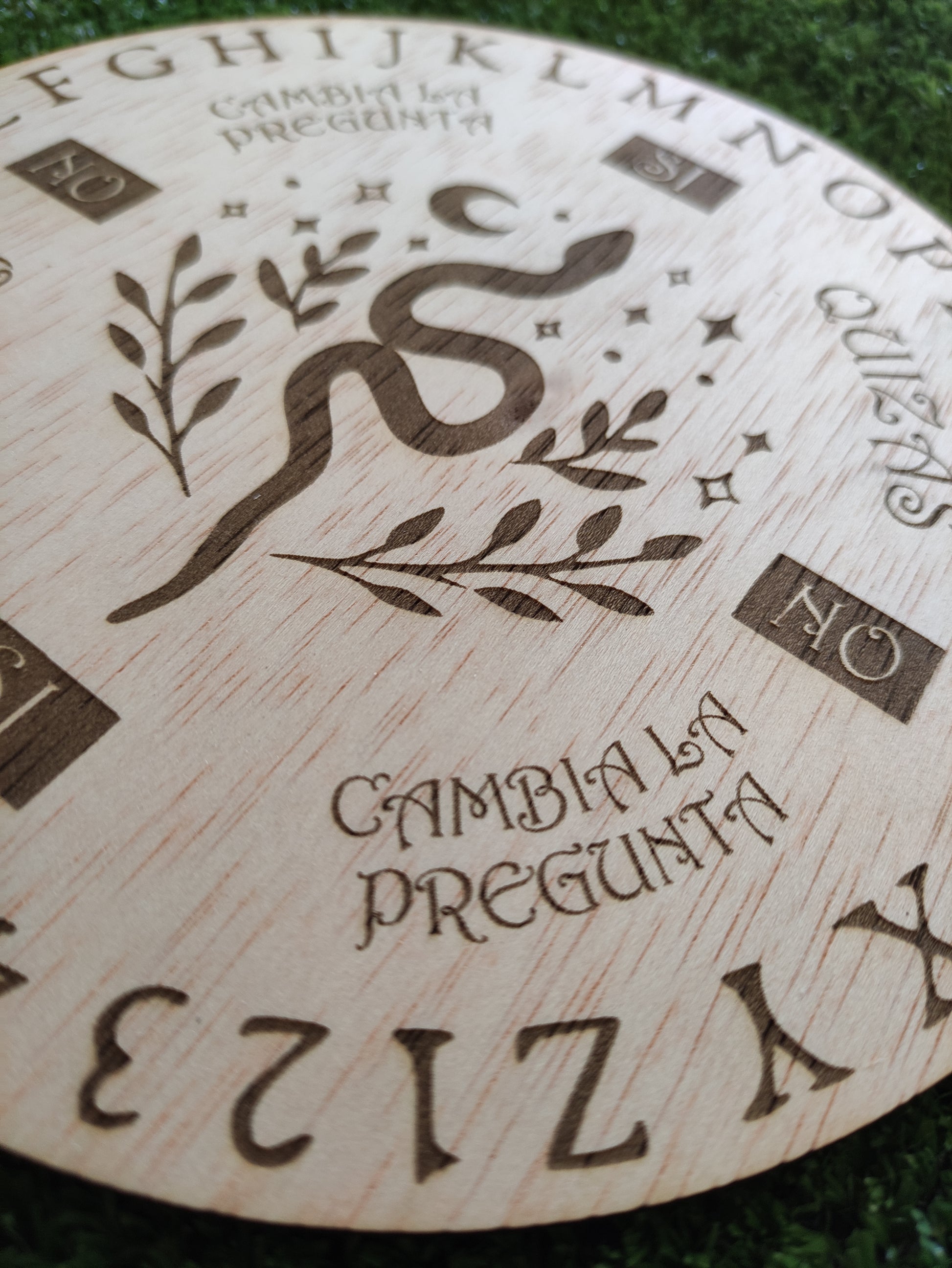 Incluye áreas para respuestas claras (Sí – No – Quizás – Cambia la pregunta), el alfabeto completo y números, permitiendo obtener mensajes más específicos, ya sea a través de palabras, fechas o símbolos canalizados.